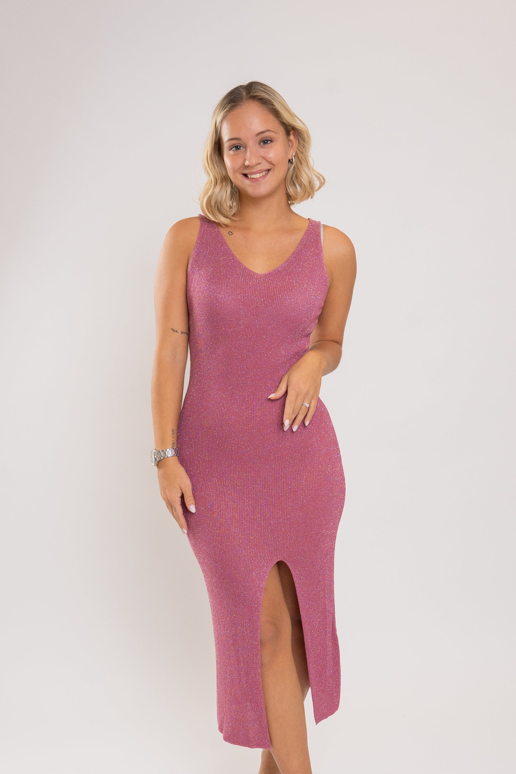 Odkrij svojo drzno stran z dolgo poletno oblekico v roza odtenku, ki rahlo prepušča svetlobo. Njen zračen in rahlo prosojen material poudari silhueto, obenem pa ohranja elegantno lahkotnost – popolna za poletne dni, ko želiš izstopati s prefinjeno drznostjo.